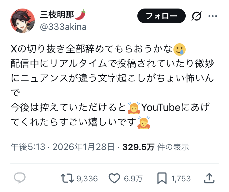 | … | 1226/01/29(木)10:19:00No.1396872230そうだねx2これに限らずにじさんじのライバーのポストが |