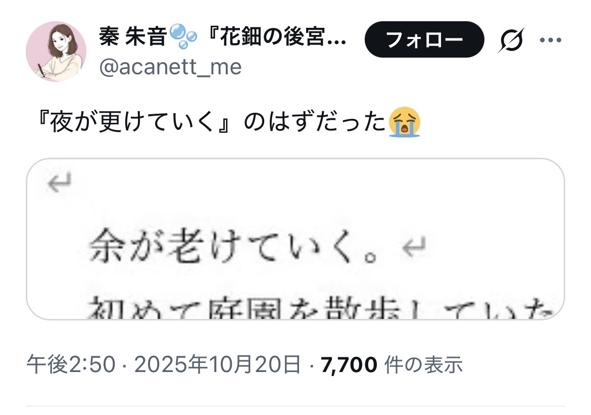 | … | 626/01/29(木)13:33:49No.1396914994そうだねx24この書き出しだけでもうかなりの名作みがある |