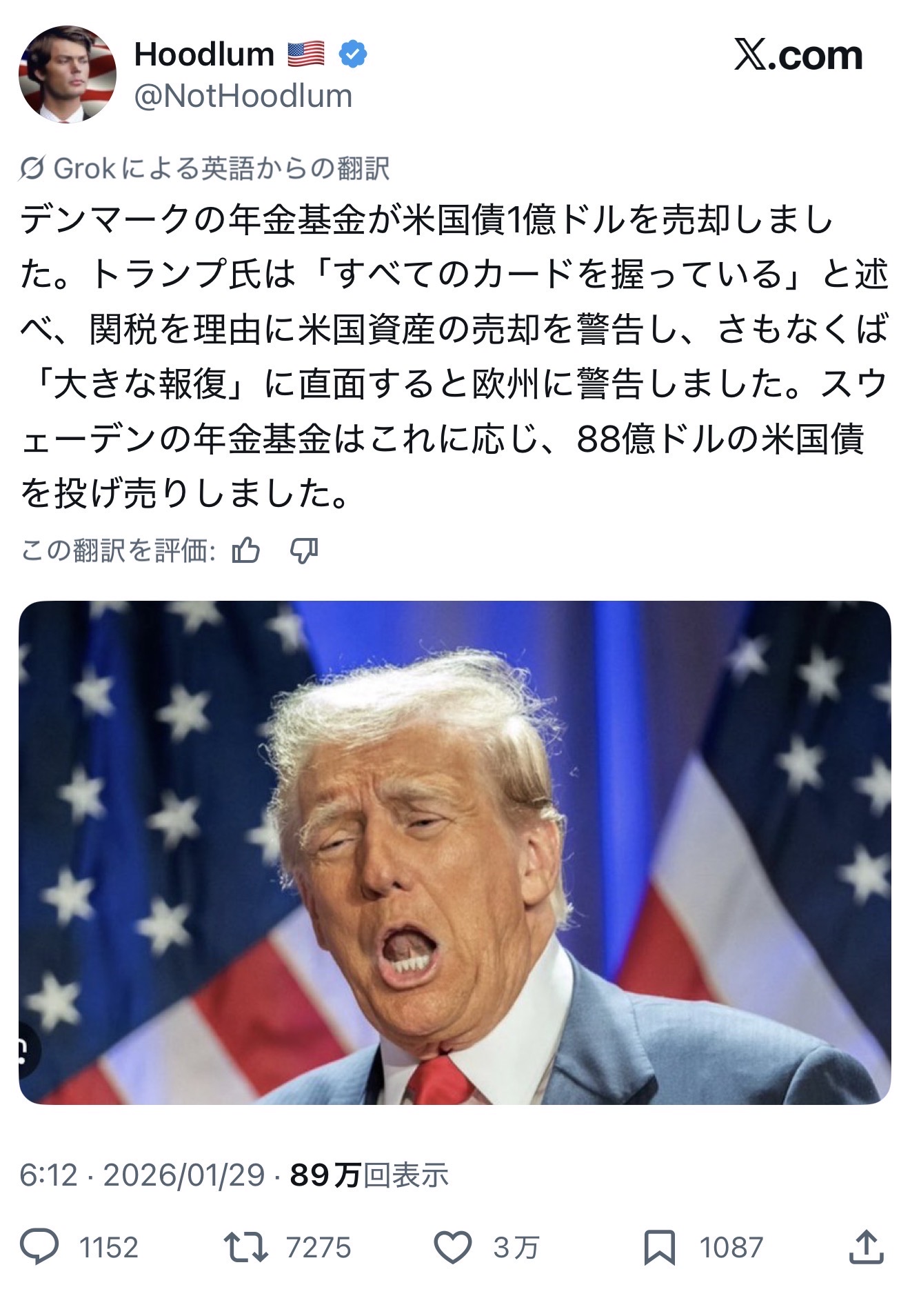 | … | 1126/01/29(木)18:34:31No.1396980604そうだねx57米国債の価値を終わらせようとしている米国大統領をトランプはどうにかしたほうがいい |
