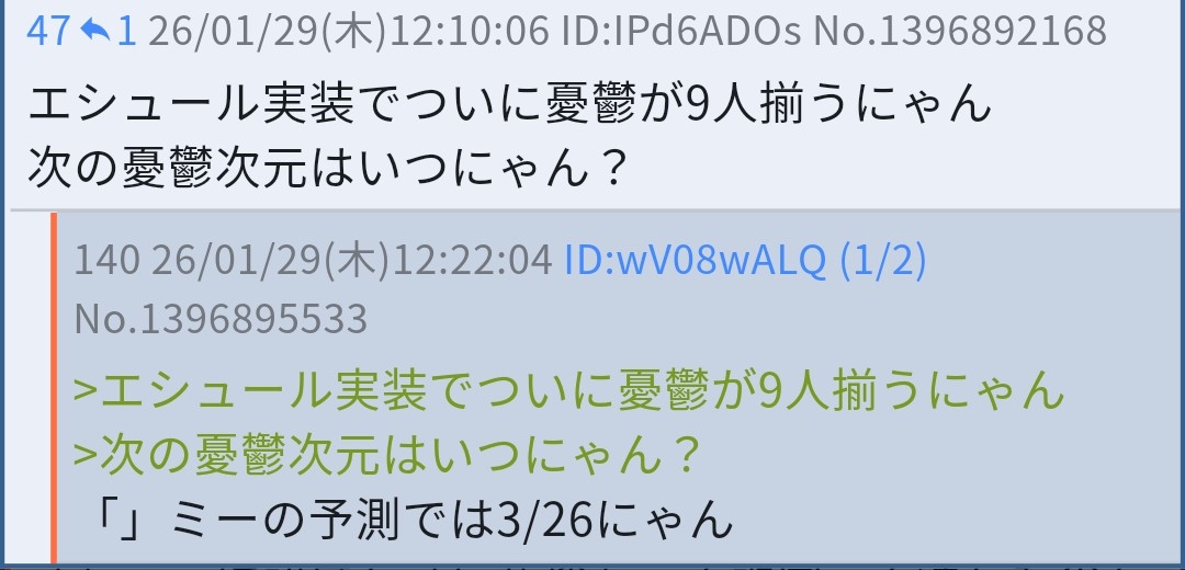 | … | 2626/01/29(木)18:58:05 ID:SM8Wj08oNo.1396987265+エシュールの発言ということにしていただきありがとうございます… |