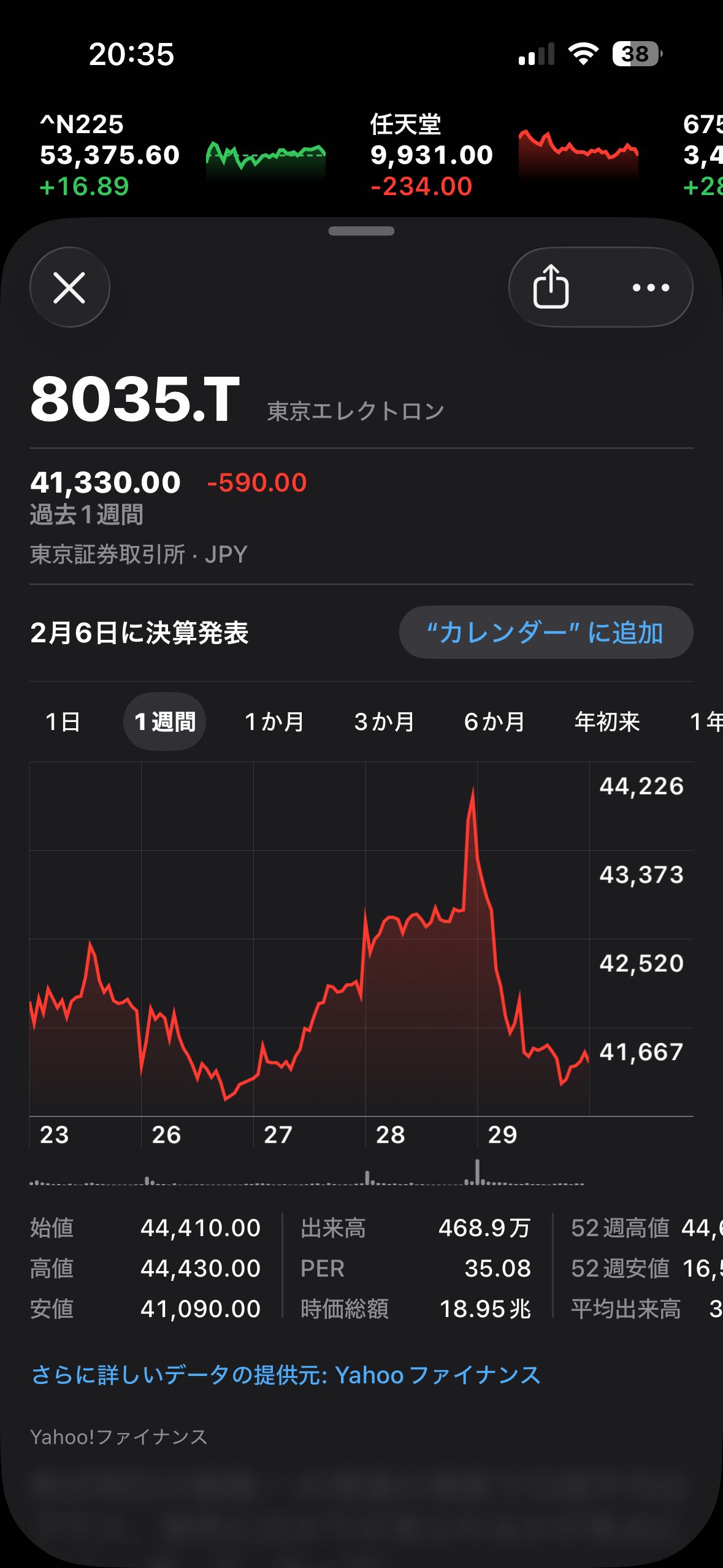 | … | 426/01/29(木)20:06:07No.1397009894そうだねx429日の東京株式市場で日経平均株価は小幅に3日続伸し、終値は前日比16円89銭(0.03%)高の5万3375円60銭だったァ〜ン❤️ |