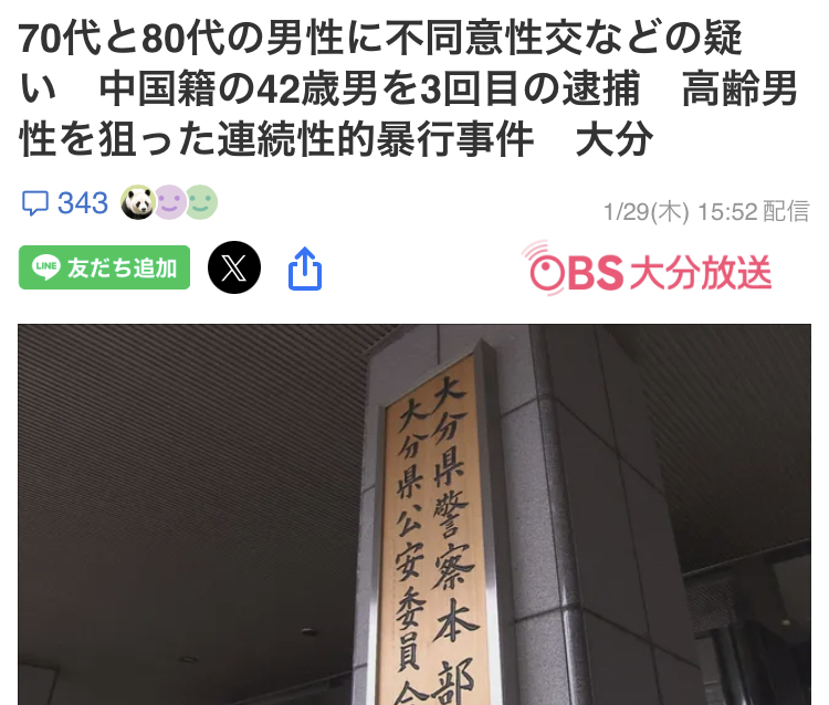 | … | 24326/01/29(木)22:20:20No.1397062295+>ちゃんと読むと中国籍42歳のジジセンホモが高齢者男性をレイプした(しかも逮捕3回目) |
