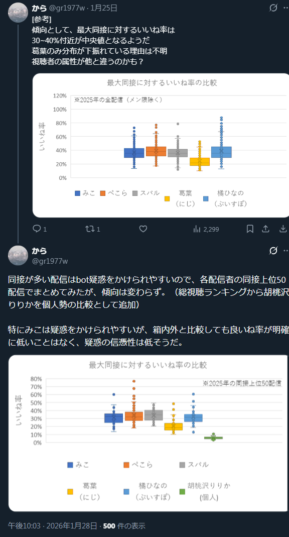 | … | 1126/01/29(木)23:43:17No.1397090295そうだねx21そろそろ懲りずにbot連呼始めたからまたにじさんじ特有の同接bot集周知するちょうどいい頃合いかもな |