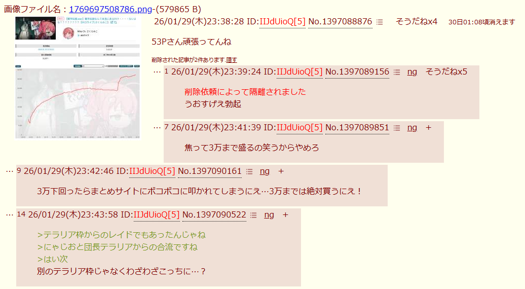 | … | 5626/01/29(木)23:50:38No.1397092645そうだねx2というかその配信の23時頃のチャット見ればレイドあったの分かるんですよ |