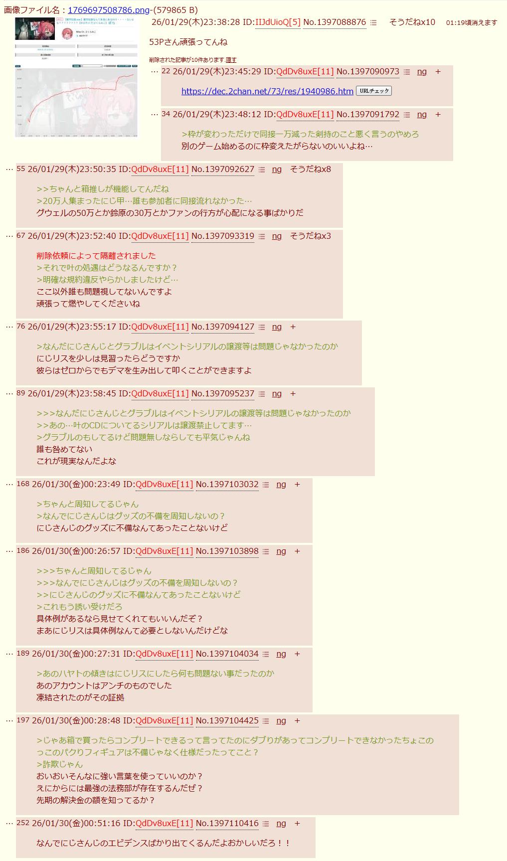 | … | 26126/01/30(金)00:57:25No.1397111820+にじさんじの腐敗はリスナーの責任も多分にあるから反省してね |