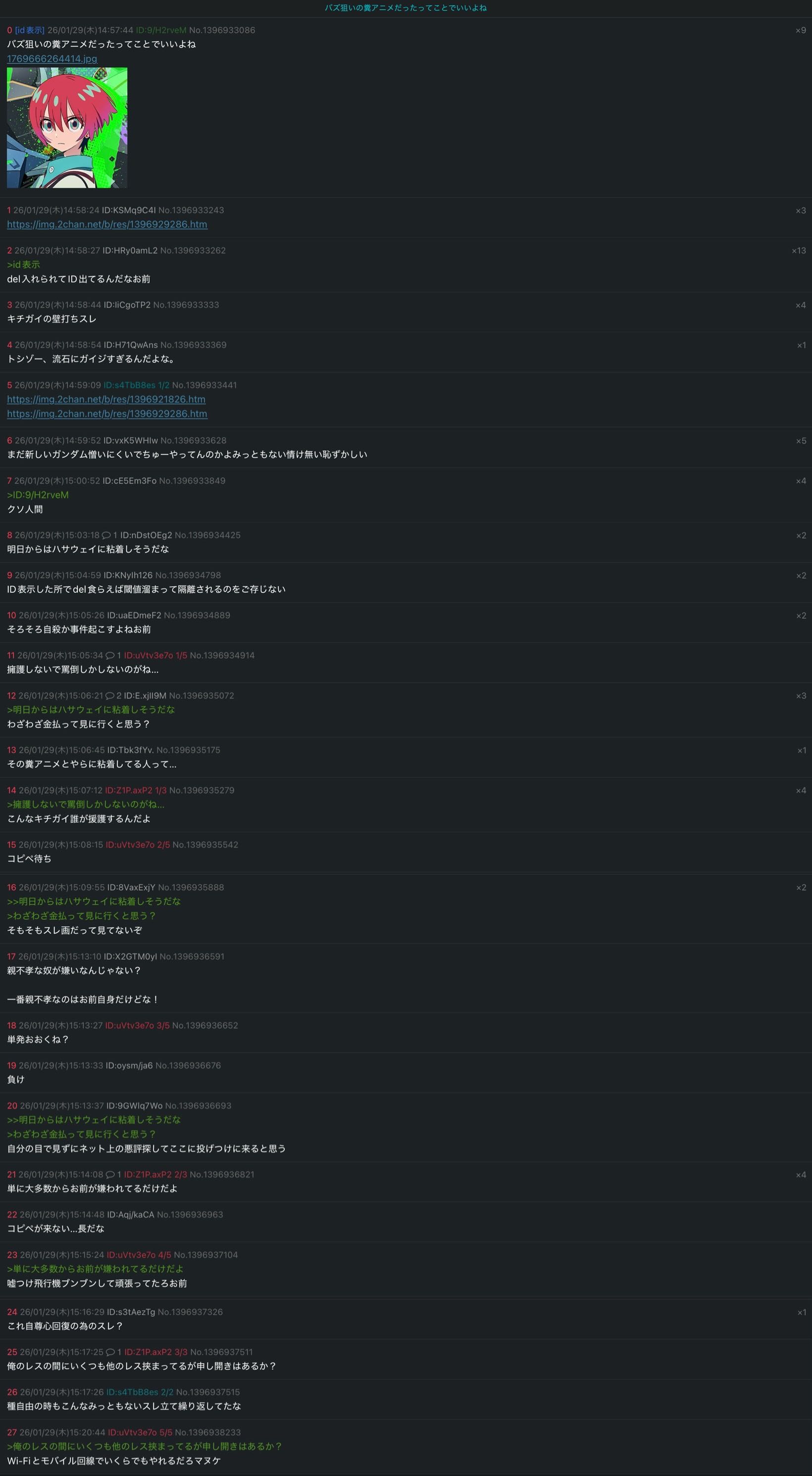 | … | 5026/01/30(金)00:08:22No.1397098210そうだねx7>なんでどの粘着荒らしも自分が言われたことを粘着対象に擦り付ける時にこれ〇〇のこと?って言うんだろうか 全部こいつだと思うよ |