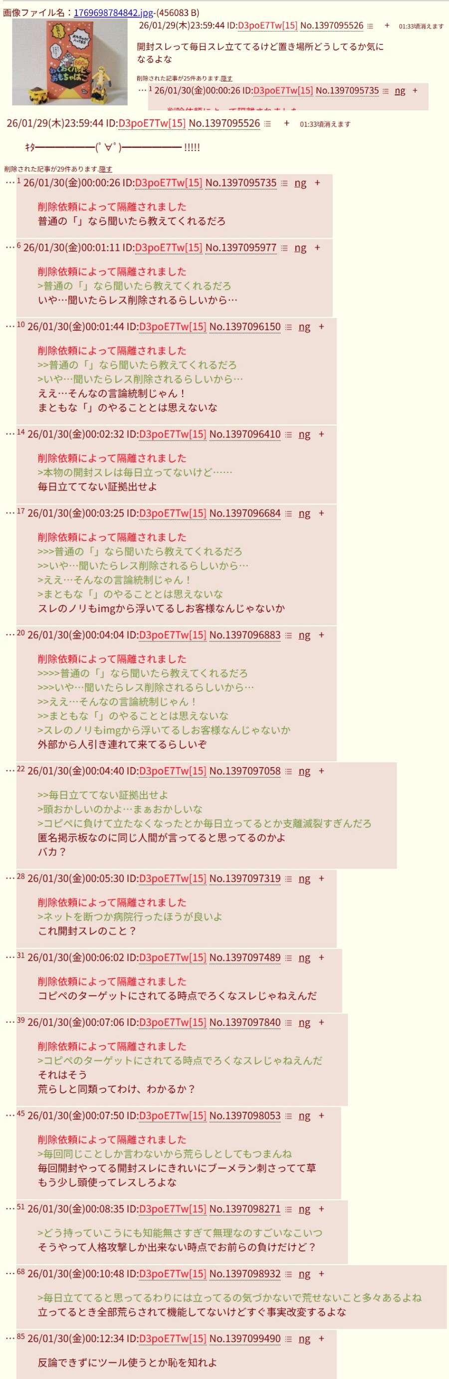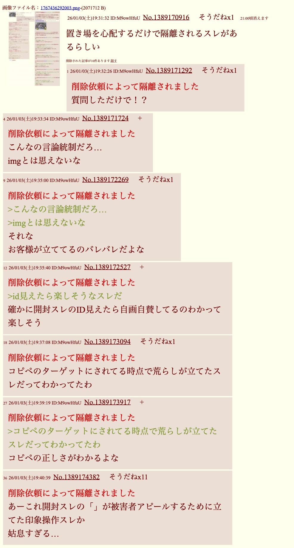 | … | 11426/01/30(金)00:15:39No.1397100549そうだねx2スレッドを立てた人によって削除されました >スレッドを立てた人によって削除されました >>f300704.png >ID出てない隔離されたレスまで含めた奴 >fu6231162.jpg 言論統制するなんて「」とは思えないな |