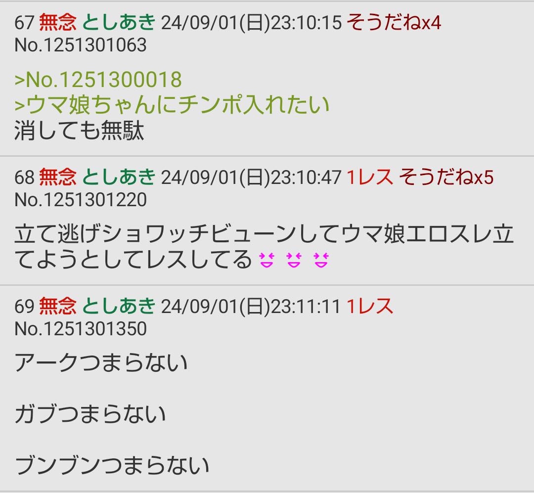 | … | 6126/01/30(金)00:09:49No.1397098655そうだねx6>そうやって人格攻撃しか出来ない時点でお前らの負けだけど? お前も普段やってることじゃん |