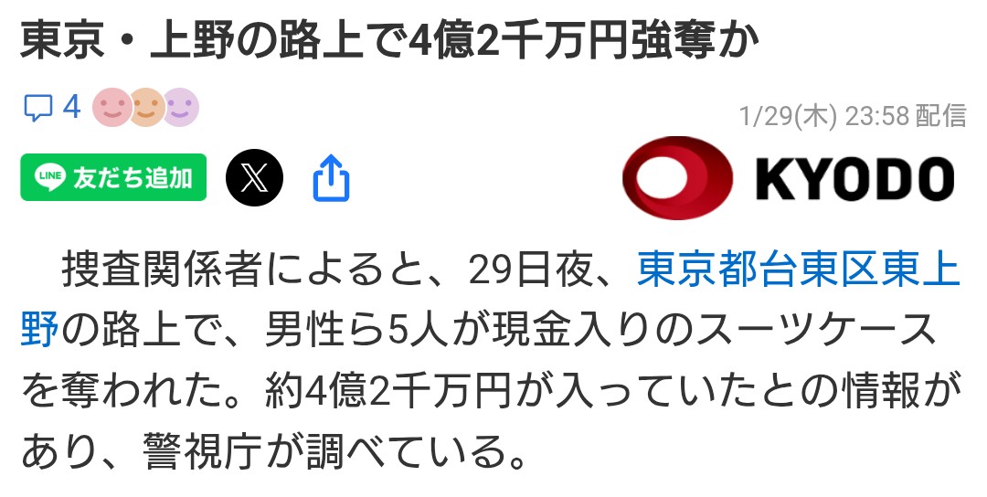| … | 1226/01/30(金)00:19:22No.1397101665そうだねx1>5人のうち日本人が2人、中国人が3人でそのうちの誰かが中国に帰るために日本円およそ4億2000万円を両替しようとしたところ複数人に催涙スプレーをかけられ現金を奪われたということです。 |