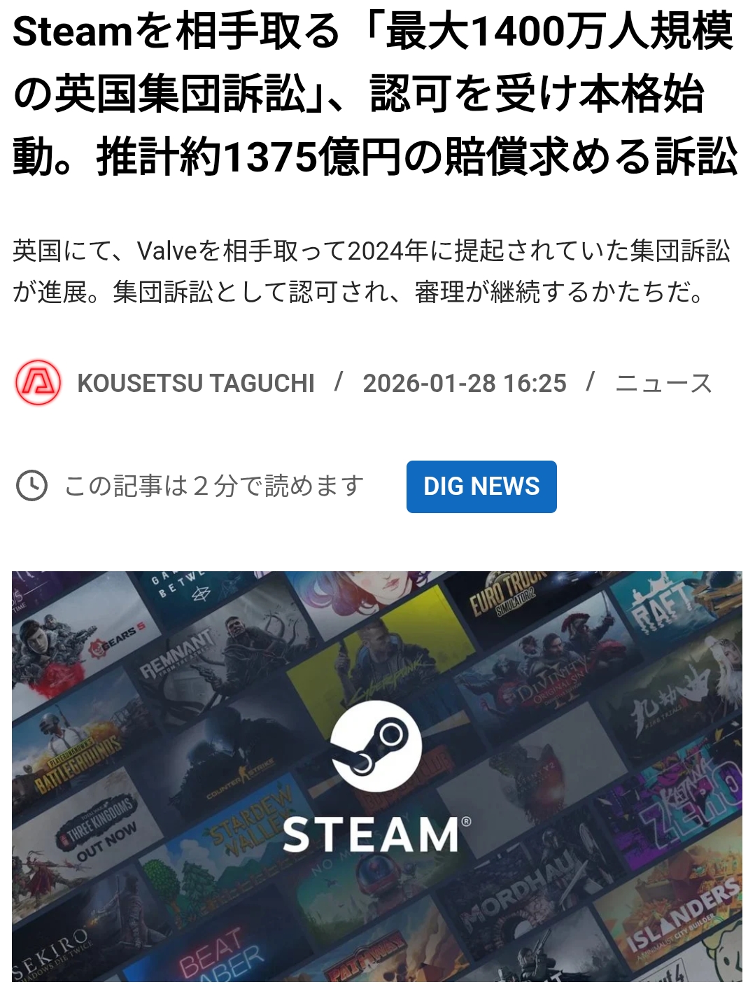 | … | 77226/01/30(金)09:57:41No.1397157662+>>本件の集団訴訟は,デジタル権利活動家のVicki Shotbolt氏が代表となり,英国在住のSteamユーザー約1400万人超を原告として,2024年7月7日に提起されたもの |