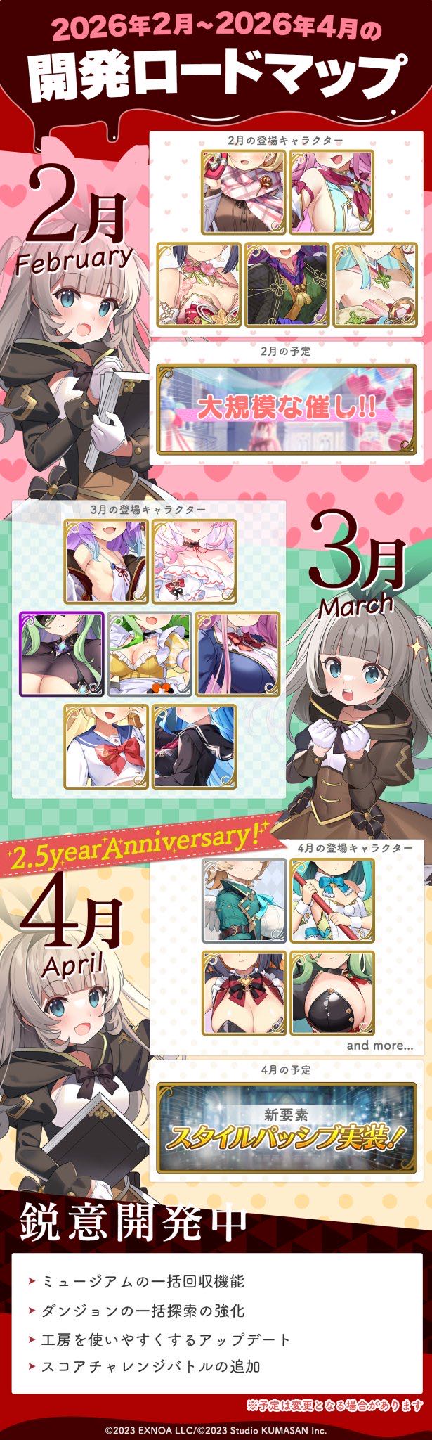 | … | 5126/01/30(金)16:09:20No.1397236925+>4月だけキャラ少ない上にand moreって入ってるの凄い不穏っす! ハニバやるんすかね今年は |
