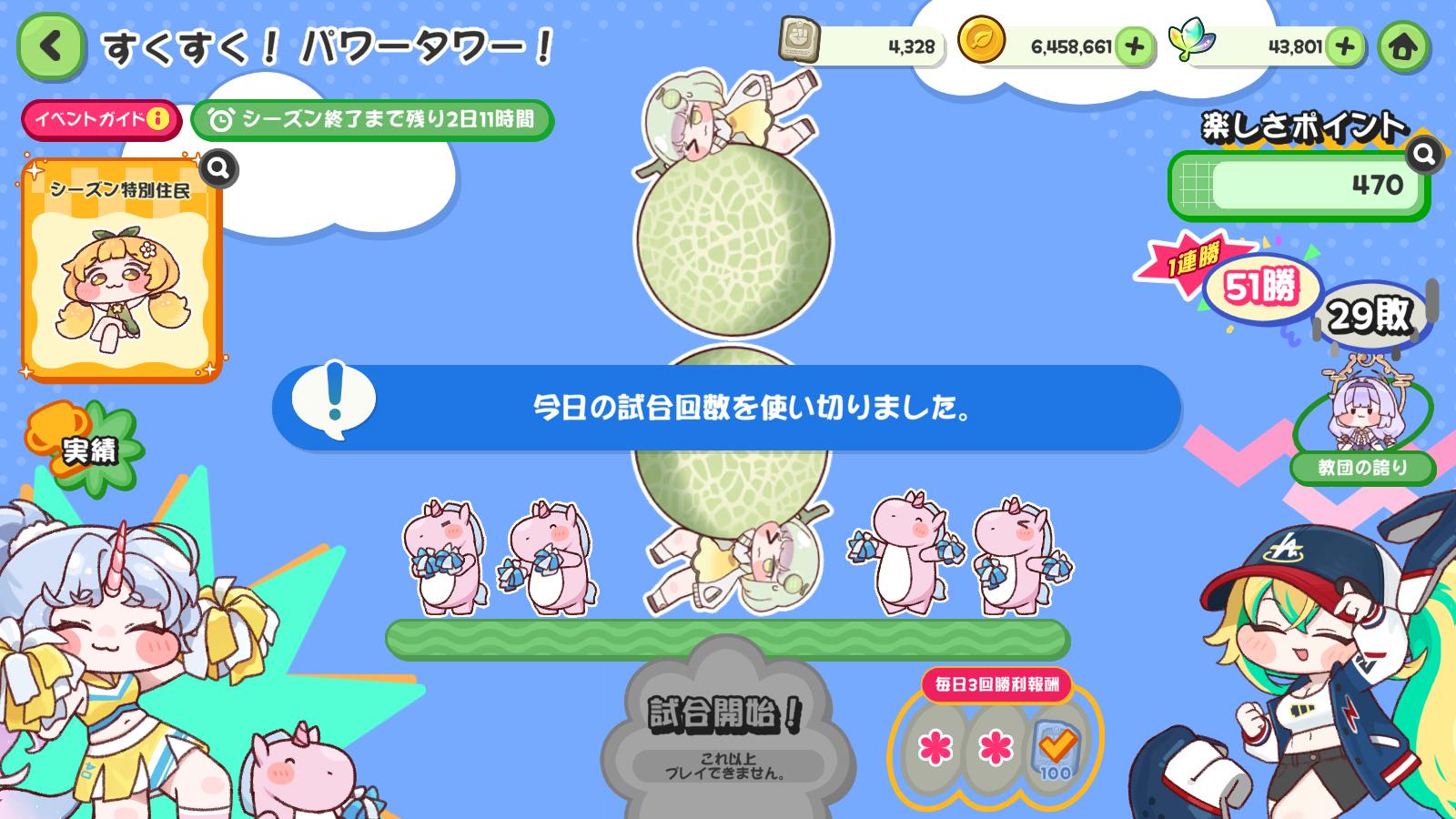 | … | 62626/01/30(金)17:46:18 ID:vxW1LuEgNo.1397255929そうだねx1これデイリー試合回数制限ってことは翌日にはまた80戦可能にゃん? |