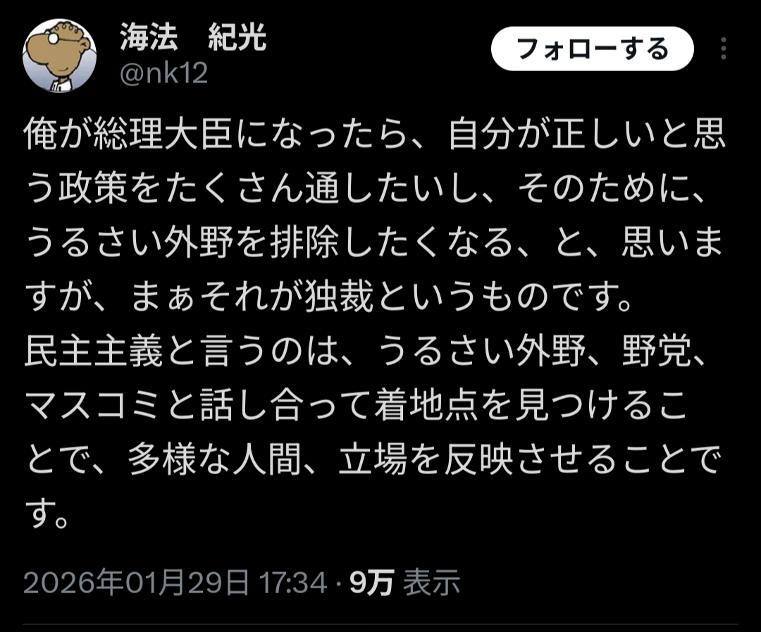| … | 426/01/30(金)18:05:39 ID:EM2Myp.UNo.1397260643そうだねx1ちゃんと有権者の信任を得て代議しに来てるなら排除しないようるさくても |