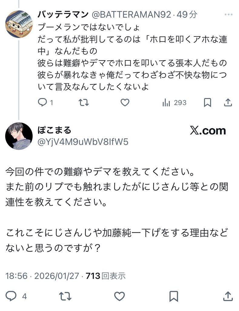 | … | 17026/01/30(金)20:51:08No.1397314316そうだねx1似たような口調と思考を持った第三者を引き連れてくることもあるぞ! |