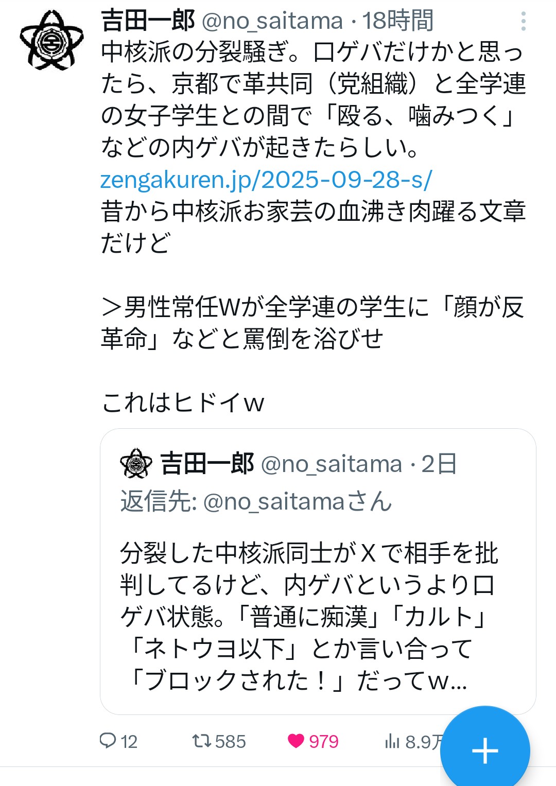 | … | 2426/01/31(土)01:39:43No.1397416589そうだねx2京大は左翼サークル取り締まったりしないの…? |