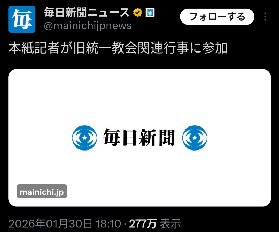 | … | 1526/01/31(土)17:21:33No.1397567747+>なお記者は統一教会関連のイベントとは知らなかったと言っているので処分等はしません |