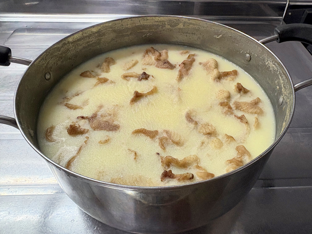 | … | 3826/01/31(土)18:52:10No.1397593436+これは鶏皮(2kg強)をネギの青いところとしょうがと一緒に煮て油を抽出してその後一回冷やした様子 |