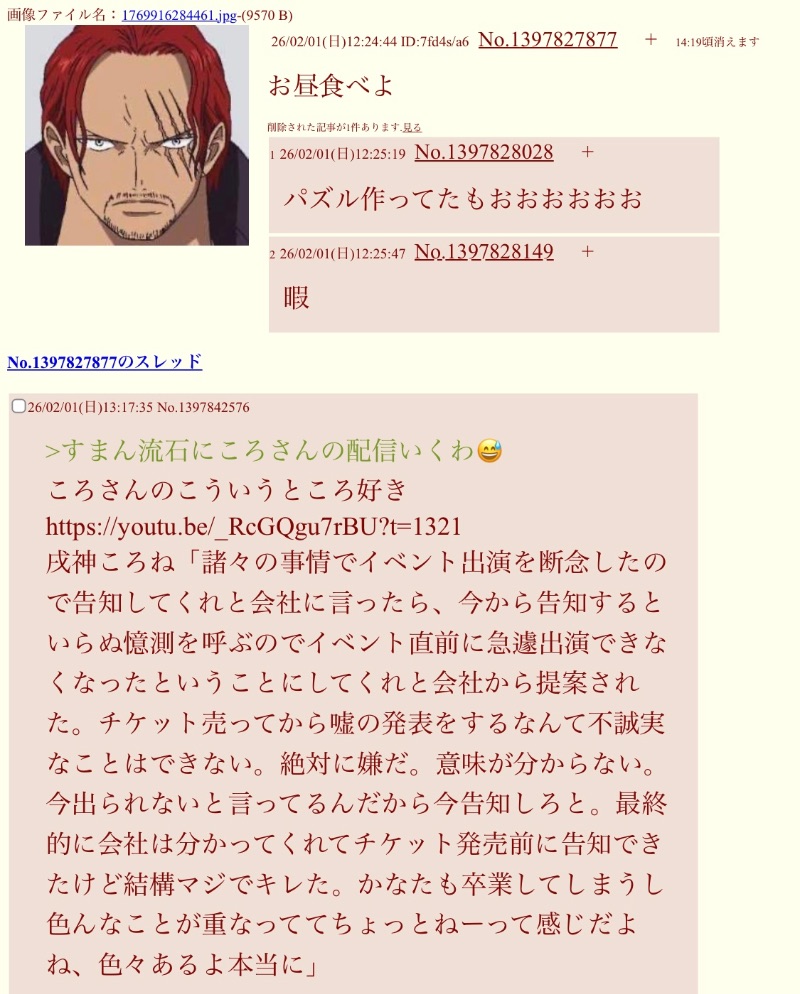 | … | 3026/02/01(日)13:52:00No.1397851375そうだねx3>スパチャいっぱいしろ!って言ってたのくーちゃんじゃん |