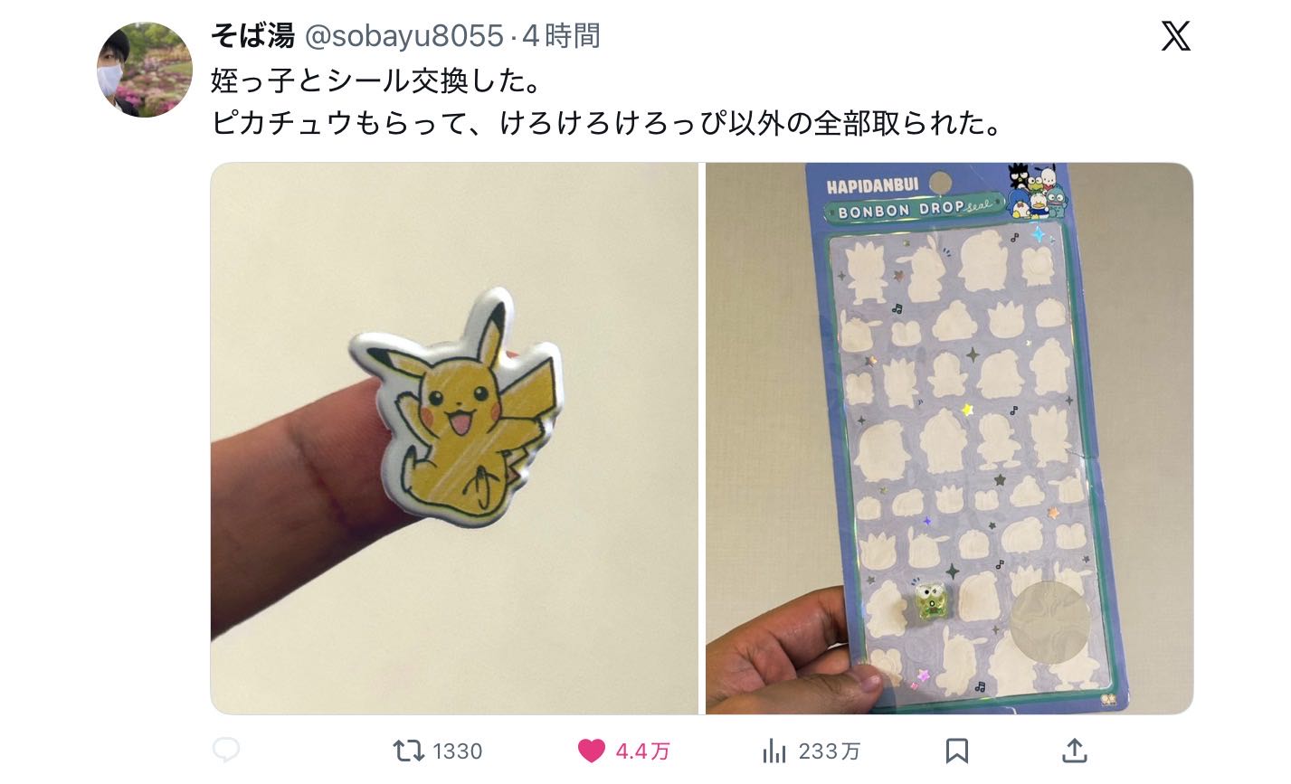 | … | 2926/02/03(火)00:46:35No.1398350293+ポケモンシールでピカチュウだけいないのはいくらけろっぴ以外のサンリオ貰ったとしても画竜点睛に欠く状態じゃないか |