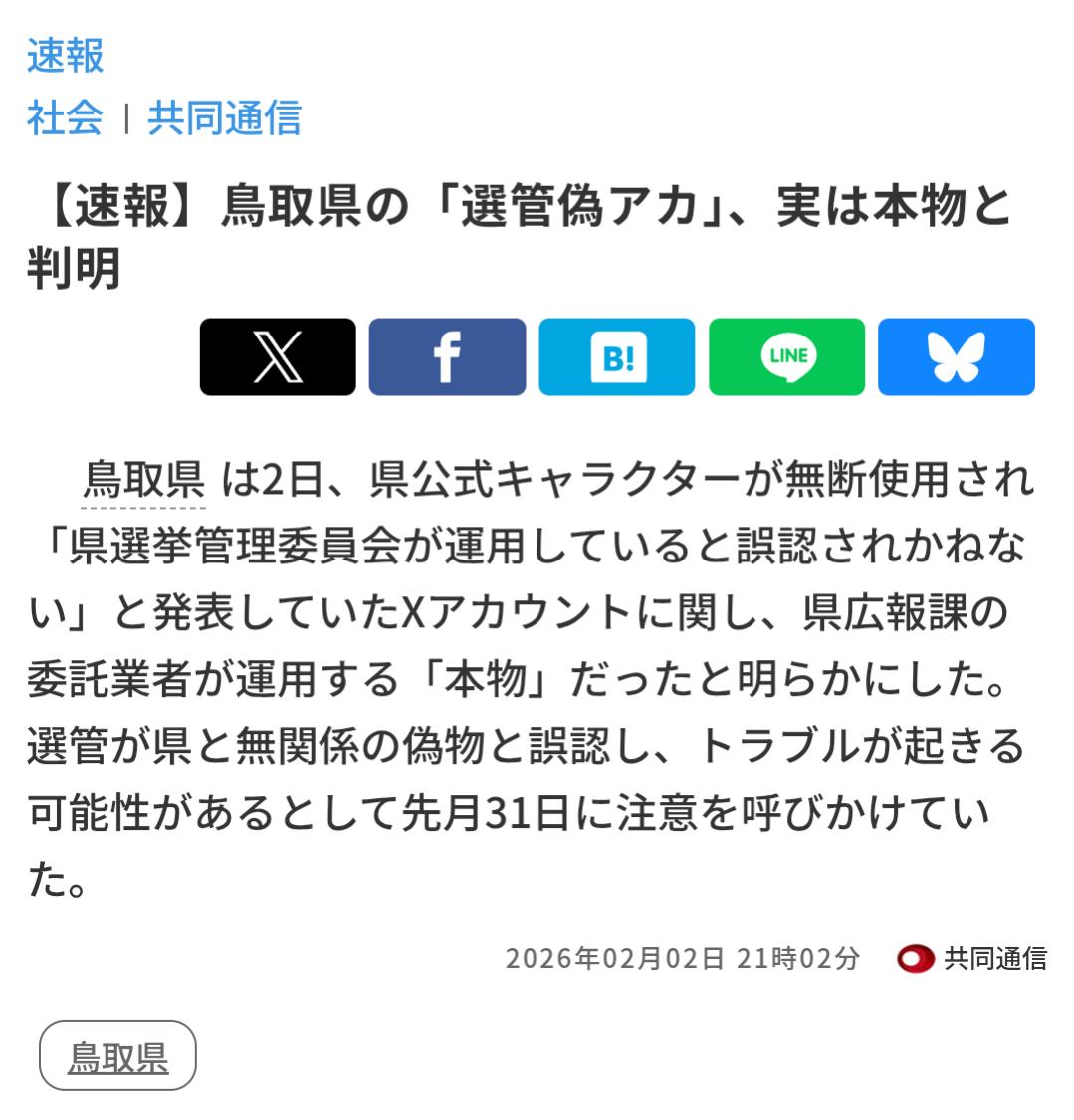 | … | 44626/02/03(火)18:07:55No.1398487916そうだねx2>>県などによると、アカウントは「第51回衆議院議員総選挙・第27回最高裁判所裁判官国民審査」と名乗り、公式キャラ画像と県選管公式サイトのリンクを表示。県と関係のない懸賞サイトに誘導する投稿をしていた。 |