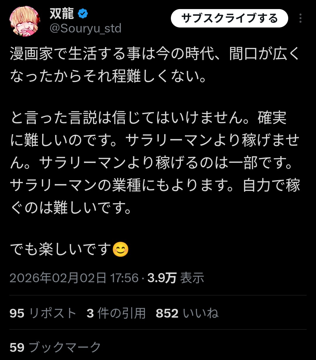 | … | 126/02/03(火)19:05:53No.1398503190そうだねx25>漫画家がサラリーマンより稼げるなんて嘘です |