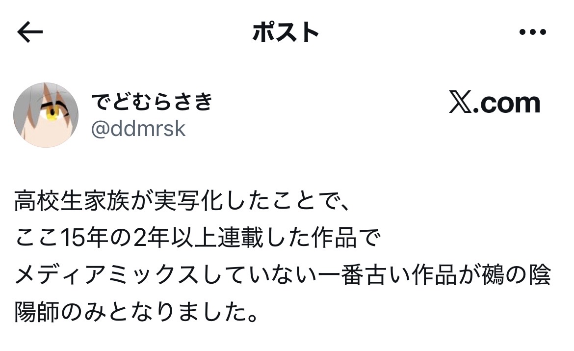 | … | 126/02/03(火)22:00:04No.1398563414そうだねx5逆になんでアニメの発表無いんだよ鵺の陰陽師 |