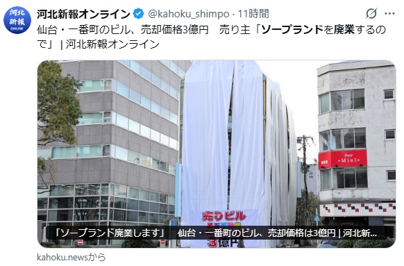 | … | 6926/02/04(水)08:19:49No.1398645911+>仙台ってもともと風俗規制厳しくて人口のわりに店めちゃくちゃ少ないからな |