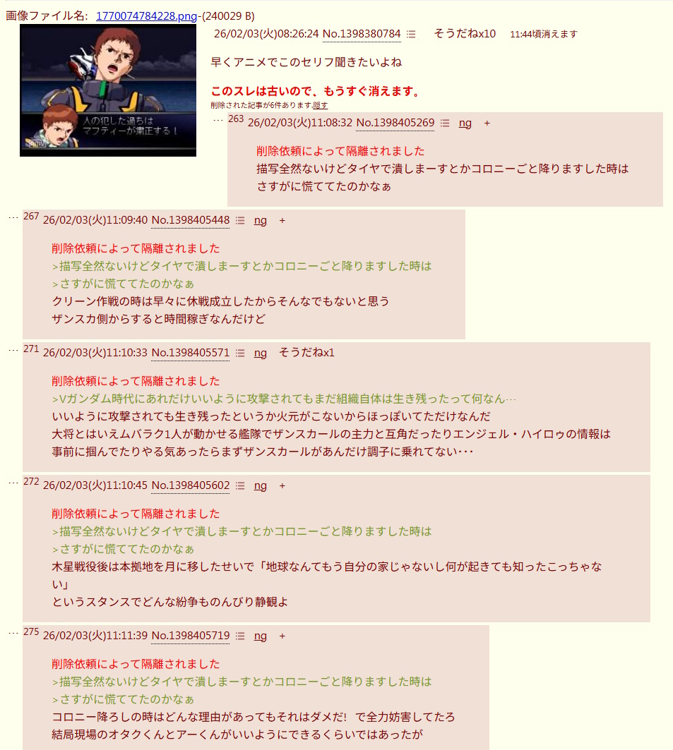 | … | 90226/02/04(水)12:46:12No.1398694618+結局のところジオンがしょうもないことしたから後の世がどんどん乱れたんじゃないっすか? |