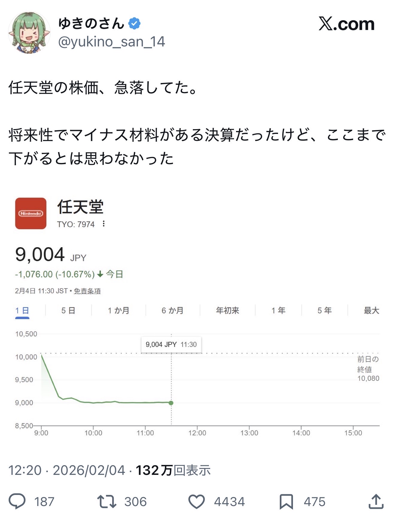 | … | 3326/02/04(水)18:12:49No.1398762965そうだねx1任天堂が好きでも株価に期待する人は盲目的だ |