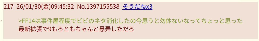 | … | 2826/02/04(水)20:49:49No.1398814162+私はFF14を続けるよ ←最高に宗教 |