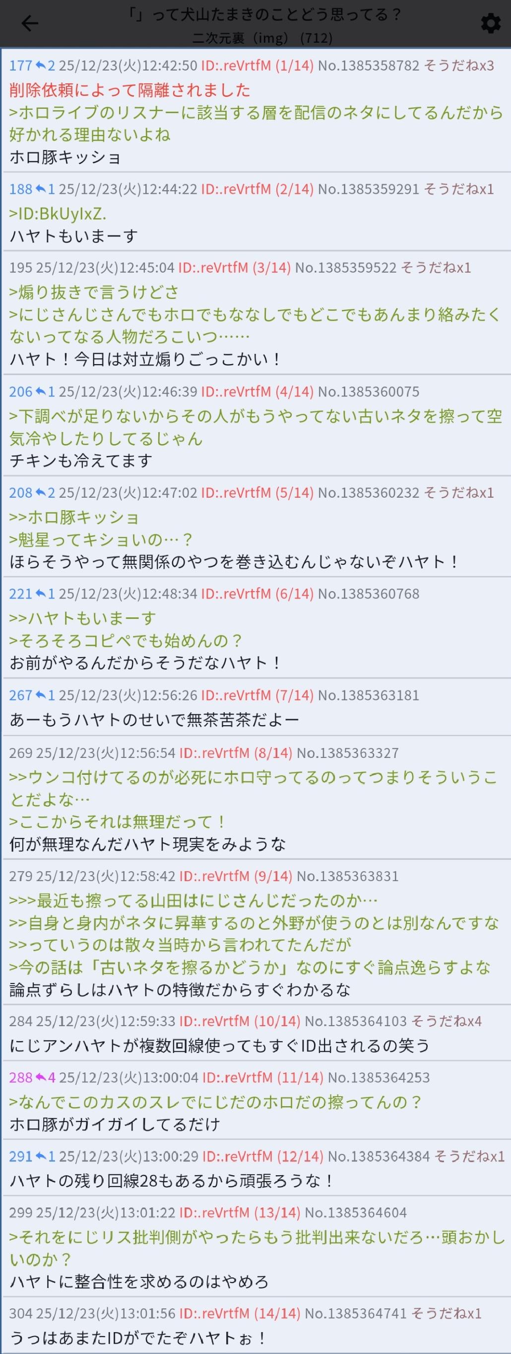| … | 45126/02/04(水)21:30:59No.1398829428+>多分だけどハヤトがこんな毎日毎日スレ立てるようなことしなけりゃにじさんじ大会の話題なんて1日かそこらで消えてたと思うよ |