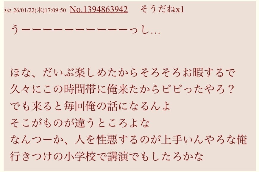| … | 4826/02/04(水)20:31:25No.1398807621そうだねx1>主語がない文章ぶつぶつ書いたら当然誤解されるんだけどあんまり人と会話してこなかったのかな…それで一々反応するの勘違いブスみたい |