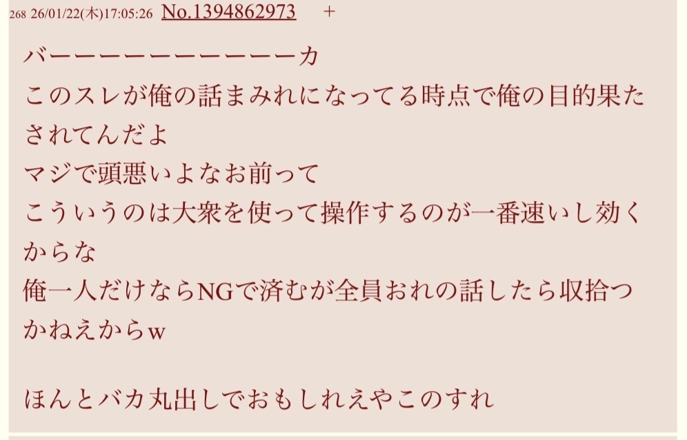 | … | 2526/02/04(水)20:28:39No.1398806670そうだねx2ハヤトのその主張はハヤトしか言ってないんで今更バレバレの工作しても無駄 |