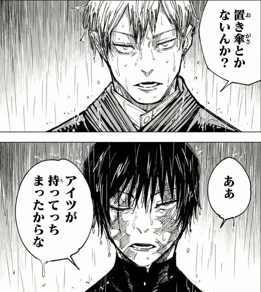 | … | 44226/02/04(水)23:27:31No.1398873660+お前の傘は…甚爾のやない! |