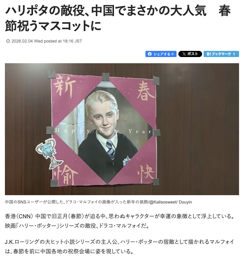 | … | 1026/02/05(木)00:47:22No.1398895516そうだねx63>幸運のシンボルとなる理由はその名前にある。「マルフォイ」の中国語表記は漢字3文字だが、このうち最初の漢字が「馬」、3番目の漢字が「福」となり、合わせて読むと馬が幸運を運んでくるように聞こえる。 |