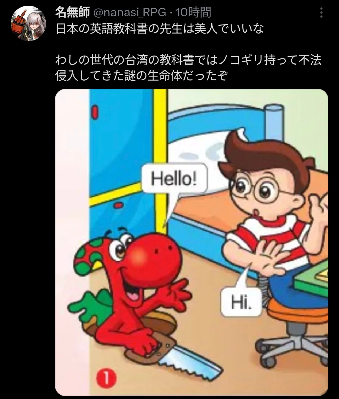 | … | 4626/02/05(木)09:23:52No.1398937002そうだねx13>いやでもスレ画の人が何歳か知らないが日本も昔の英語教材の先生なんか目が点の人だったりしたぞ |