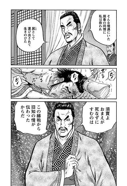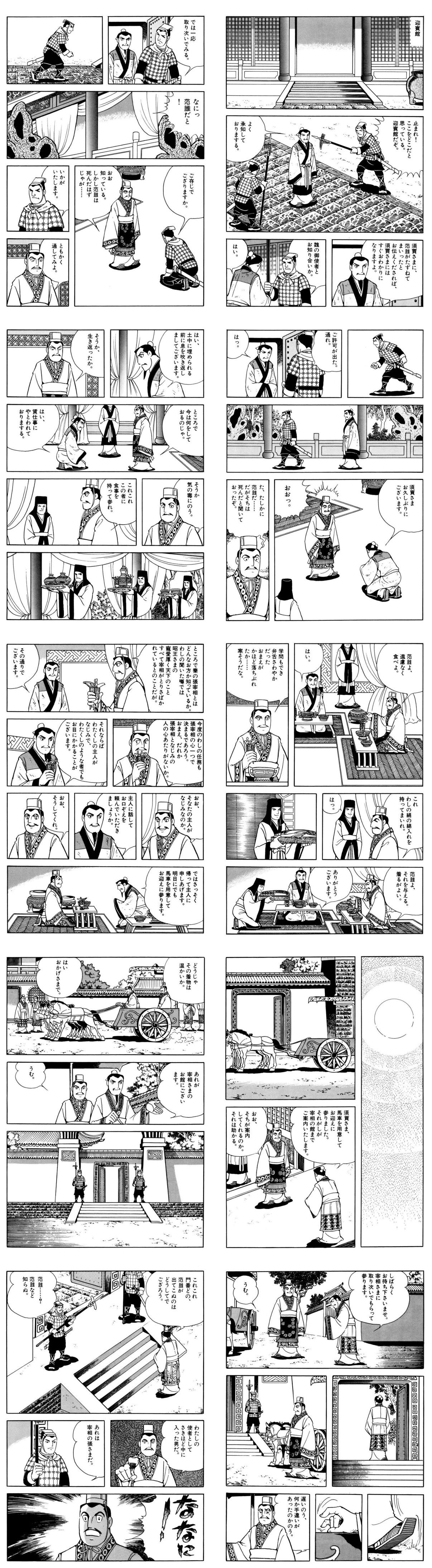 | … | 7326/02/05(木)12:24:04No.1398969958そうだねx2>魏斉だけでなく須賈に対しても強い復讐心を抱いていた范雎だったが、直前に須賈が見せた旧縁の情でこれを幾分許し、各国の要人を招いた宴席を設けて須賈を下座に座らせ両脇には囚人を座らせるとその前に飼い葉桶に秣と大豆を詰めて供し、須賈に馬の様にこれを食べさせる恥辱を与え、魏王に魏斉を殺して差し出せば魏を攻めるのを止めるが、それをしない場合は魏都の大梁(現在の河南省開封市)を皆殺しにすると伝言を与え帰国させた。 |