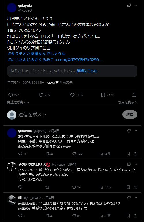 | … | 2026/02/06(金)10:53:57No.1399250272そうだねx17>>別になんでも良いけど完全に内紛の結果なのにこれは全てさくらみこのせい!!!!!って言いだすのおかしいだろ |