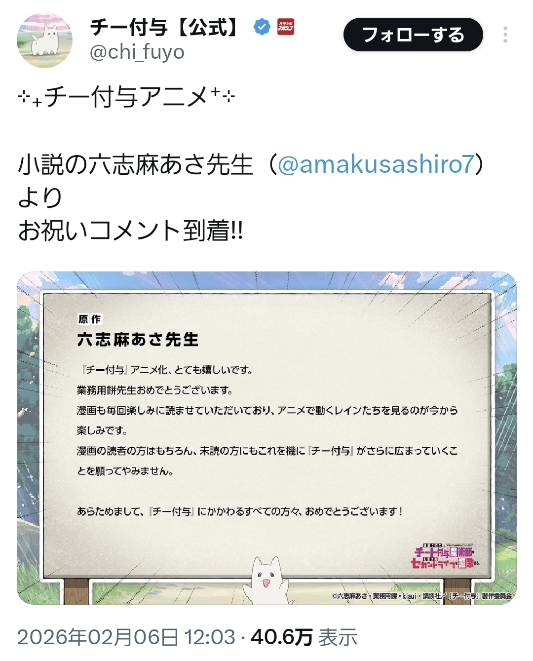 | … | 20426/02/06(金)17:33:28No.1399345802+>原作者もしかしてこれが初アニメ化?まあどんな形でも嬉しいかもしれん… |