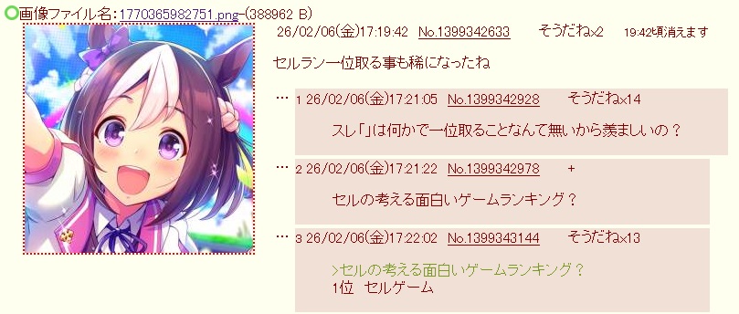 | … | 626/02/06(金)17:23:19No.1399343449+>1位 セルゲーム |