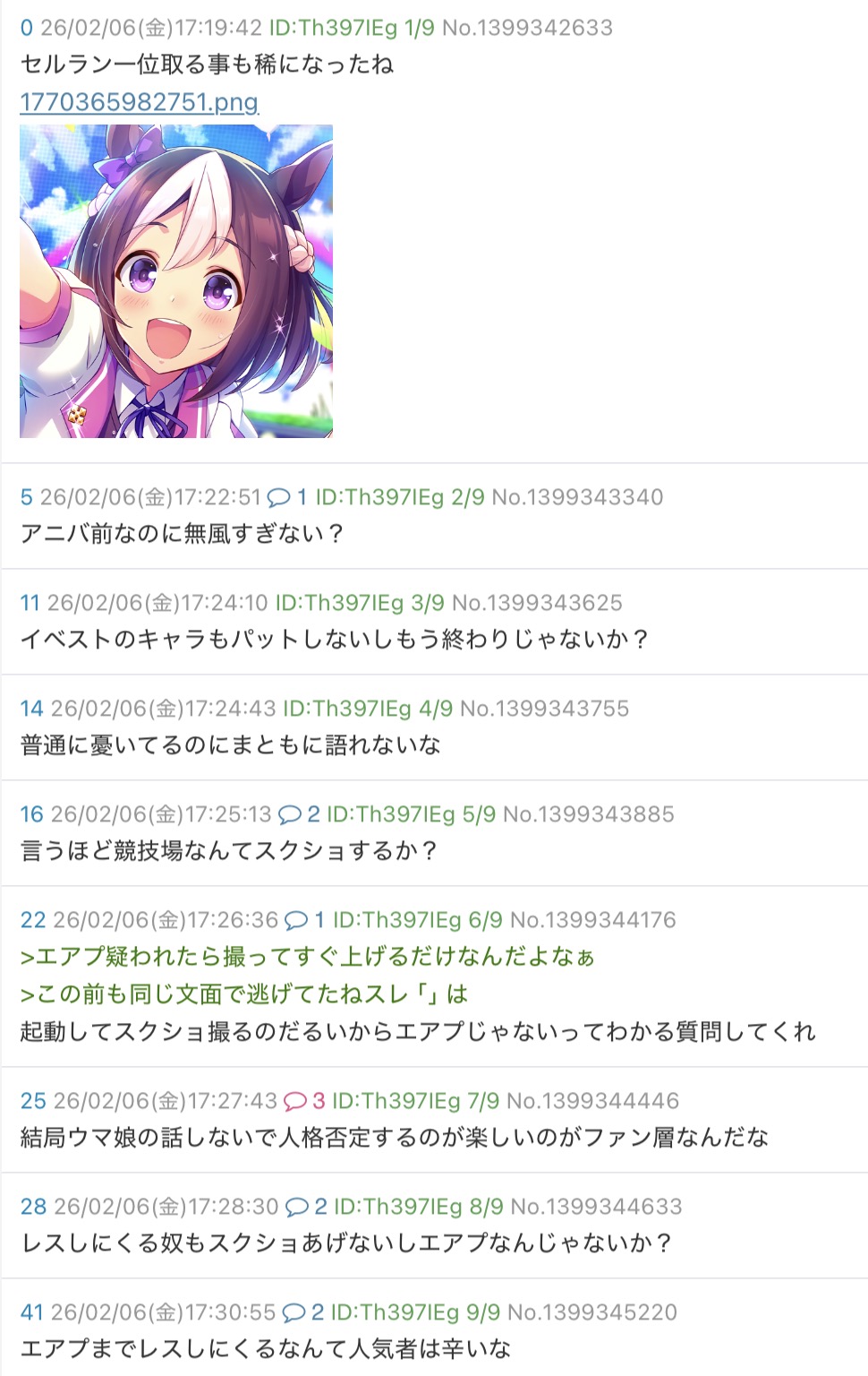 | … | 5026/02/06(金)17:34:43No.1399346079そうだねx1>結局ウマ娘の話しないで人格否定するのが楽しいのがファン層なんだな |
