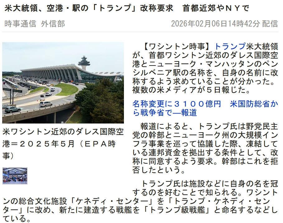 | … | 1826/02/06(金)19:26:39No.1399377225そうだねx1トランプDCに改名はしないのか? |