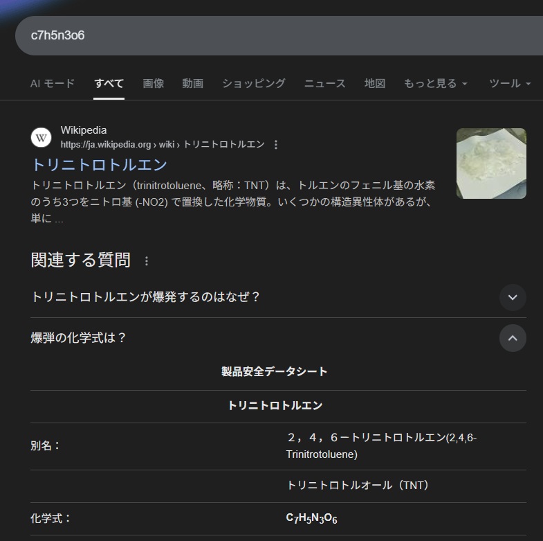 | … | 13126/02/06(金)22:03:12No.1399437250そうだねx7>どうして黒板にTNTの燃焼反応を…? 盛り上がって来たわね〜 |