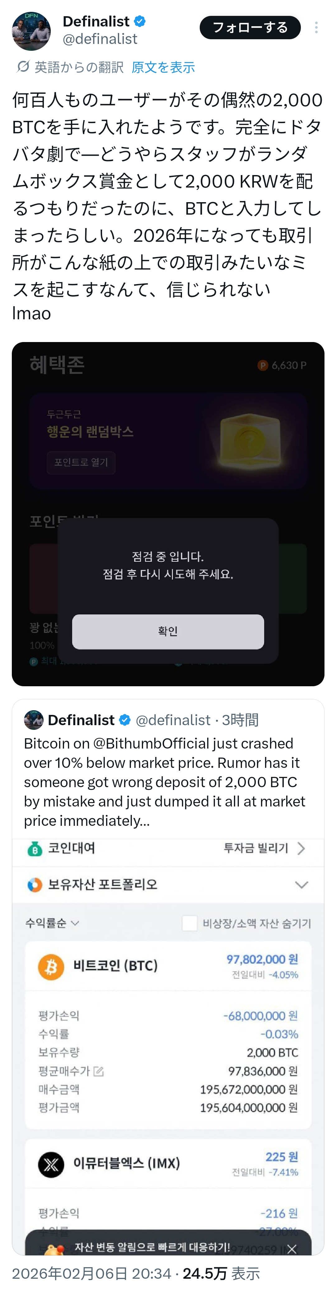 金融当局によると、ビットコイン売却後に実際に出金された金額は約30億ウォンに達する。一部ユーザーは即時に成行で売却し、数億ウォンの差益を実現したとされる。