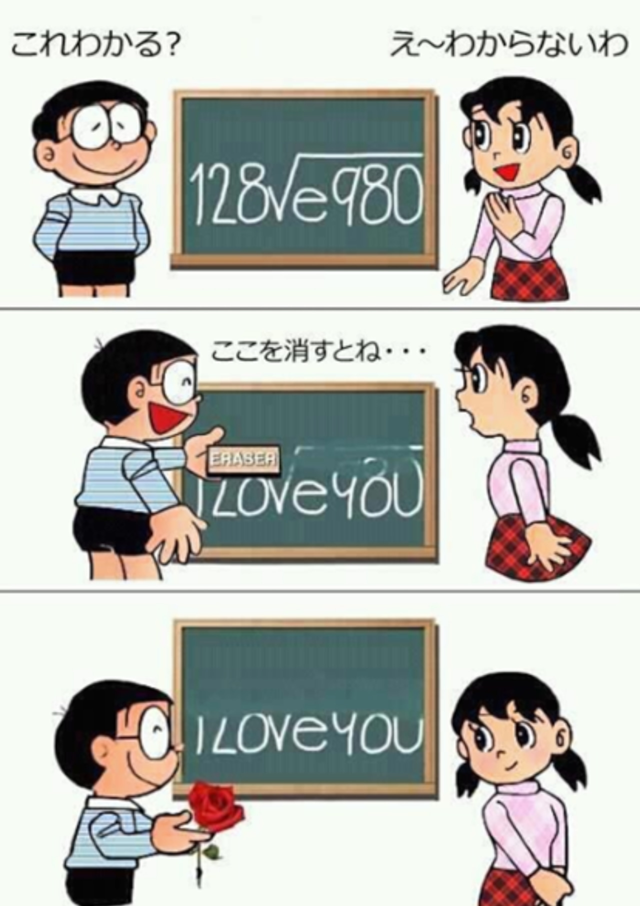 | … | 1326/02/07(土)14:56:29No.1399629890そうだねx1数式の上半分を消すとI LOVE YOUになるネタを改変して意味不明にしたのがスレ画だよ |