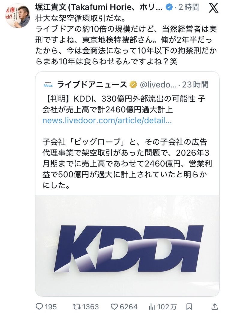 | … | 6526/02/07(土)19:41:03No.1399712790+ライブドアは最初から検察案件でKDDIはまた違うんでないのか |