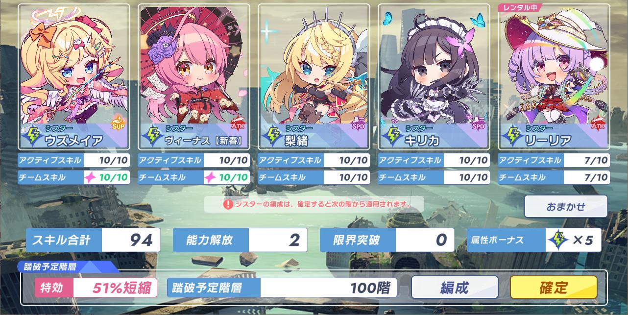 キラキラのシスター塔とか言うやつ手持ちのシスターのスキル全部強化してレンタルも借りたけど95回で止まってしまったわん