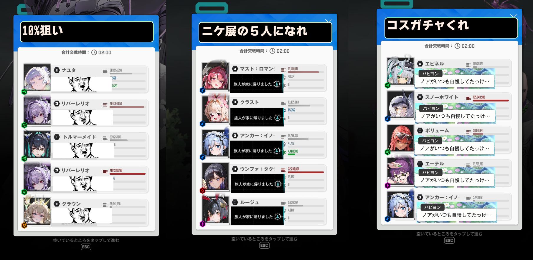 | … | 4526/02/07(土)23:06:38No.1399799271+選択時間が短いって人は主力ニケ機能を使って前もって使いそうなニケを登録しておけば |