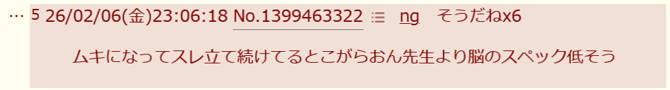 | … | 5026/02/07(土)23:00:59No.1399796870+>なにいっても負けるからコピペ以外できないの |