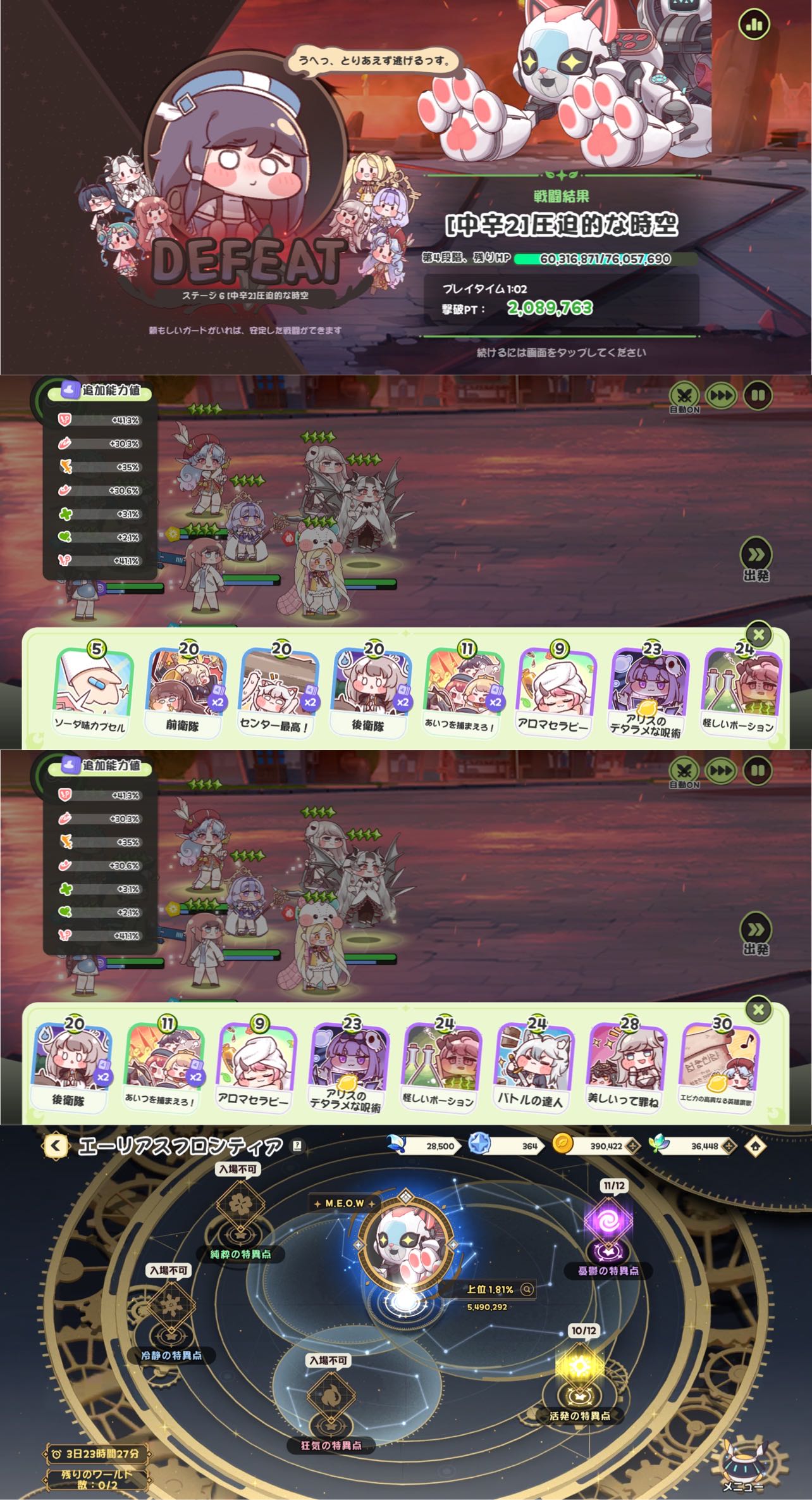 | … | 34026/02/08(日)11:55:15 ID:oES9Dhe.No.1399951758+>>10は…ヌルゲーしつつ前衛を砥石とかでカチカチにして行けた記憶があるにゃん >>11はモモで12もモモしたにゃん >>ソーダx2とモモに聖杯とペンダントを付けるにゃん >>スペカアリス添えて盤石の構えにしてもいいにゃん >砥石ヴィヴィ棒ライフジェム積んでもコミーがワンパンなんだね。 >全8装備に装備強化MAXでもダメだからお手上げにゃん >クレヨンが足りないか… 前衛3にして防御の分攻撃に回すにゃん |